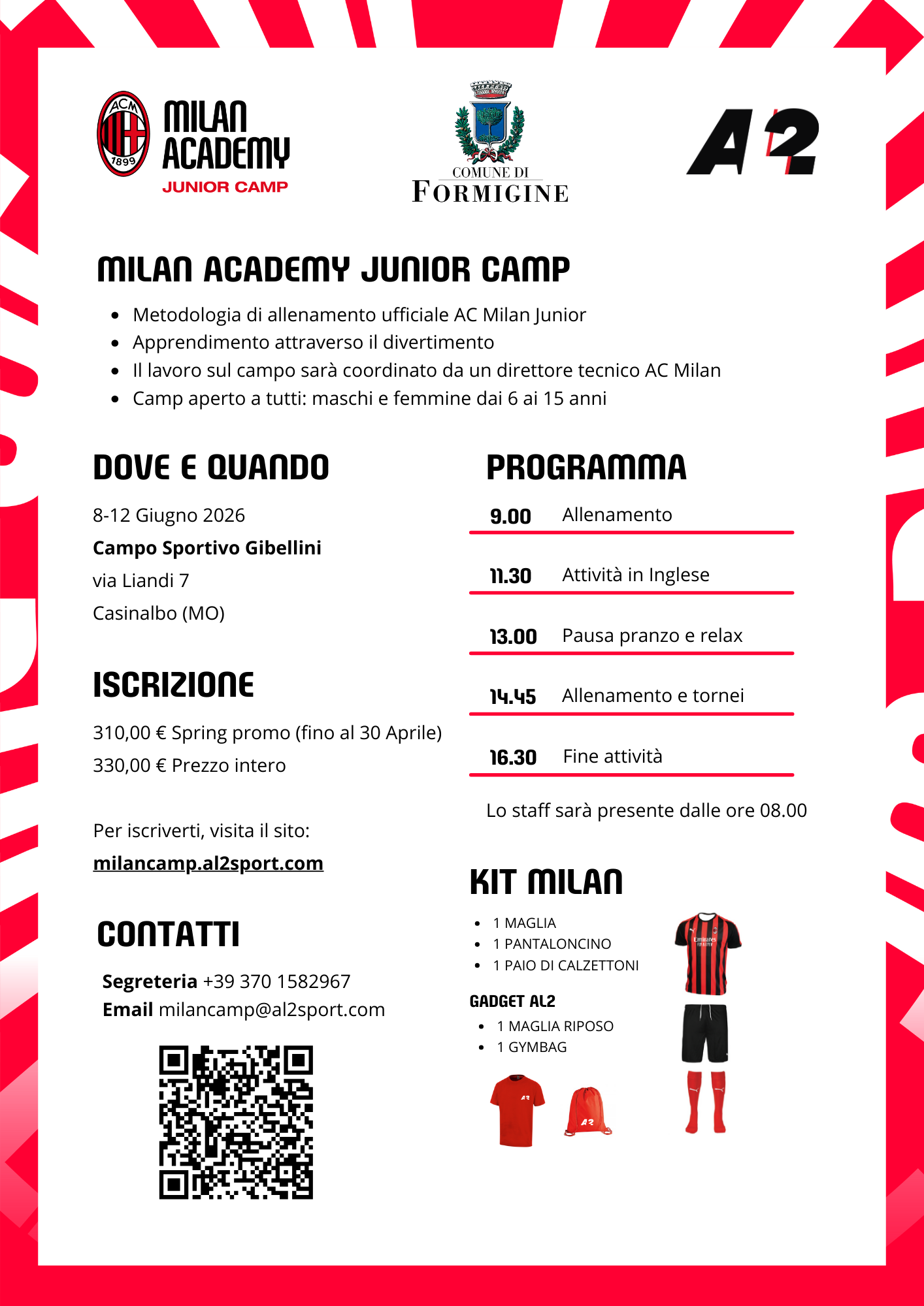 Sotto la guida di un Direttore Tecnico AC Milan, i partecipanti potranno vivere un’esperienza all’insegna del divertimento migliorando le proprie capacità e conoscendo tanti nuovi amici con la stessa passione.